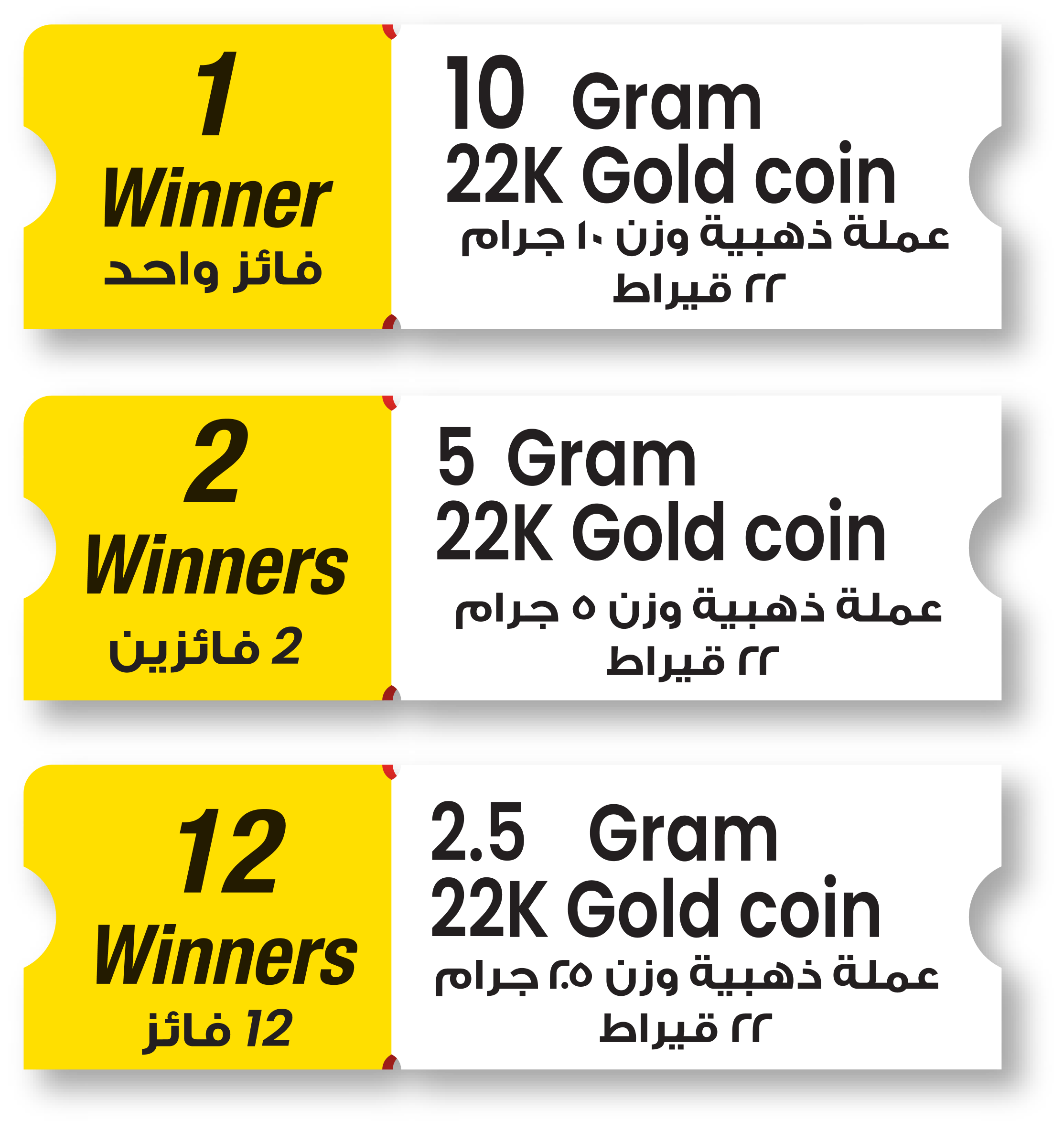 First prize: 10 Gram 22K Gold coin (1 Winner)